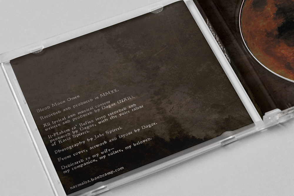Blood Moon Omen is NAR's 3rd black metal album, following The Dying Breed (2018), and the debut album The Voice of Death (2014). The concept 'NAR' was conceived in early 2013 by Dagor, the founder and creator of the one-man project. Musical and lyrical influences for this album come from the social/spiritual spectrum, humanity, mythology, and the personal quest for good or evil.